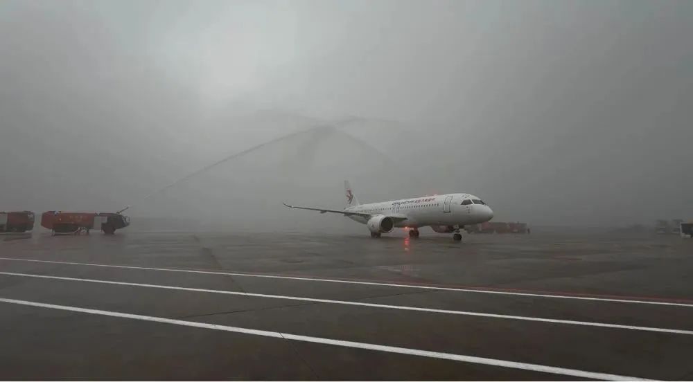 国产大飞机C919在重庆江北国际机场通过水门。新华社记者 赵佳乐 摄