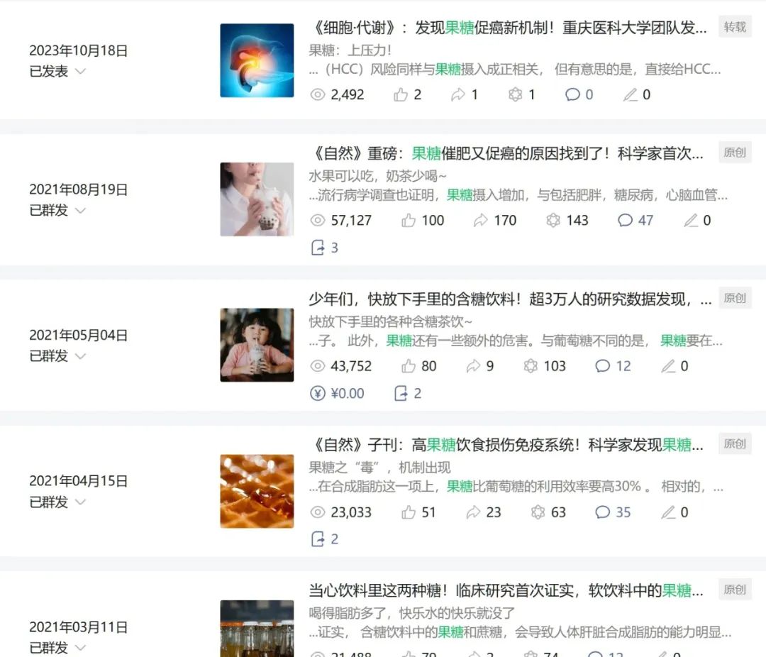 这几年,糖类的风评可以说是一个急转直下。特别是果糖,我记得以前还有人夸过果糖热量低、升糖慢,可现在随手在我们后台一搜索,跳出来的简直没一个好消息,果糖促癌特别瞩目。