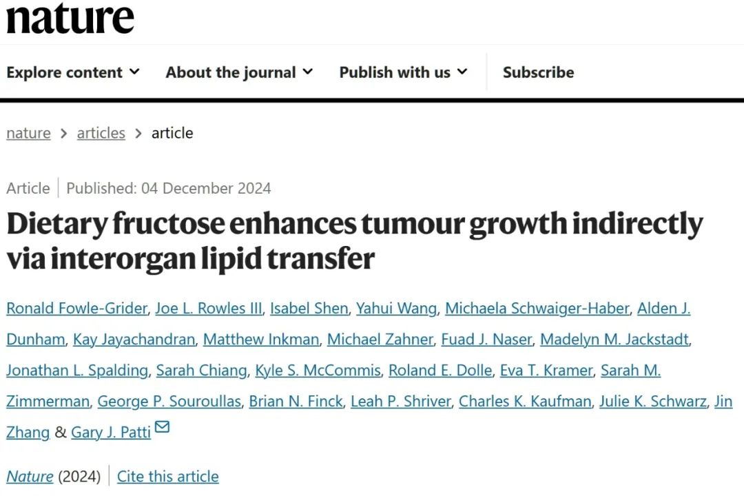 [1]Fowle-Grider, R., Rowles, J.L., Shen, I. et al. Dietary fructose enhances tumour growth indirectly via interorgan lipid transfer. Nature (2024). https://doi.org/10.1038/s41586-024-08258-3