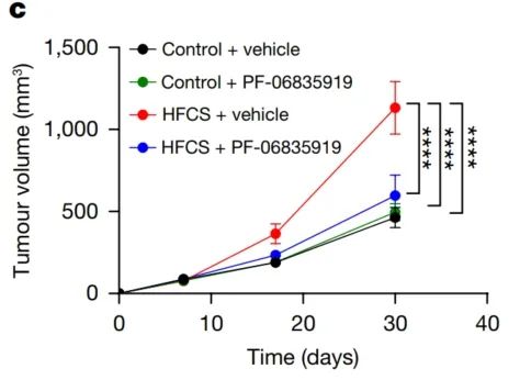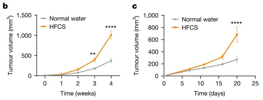研究者测试了BrafV600E黑色素瘤、E0771乳腺癌、CaSki宫颈癌、TC-1肺癌,在小鼠中,都观察到20%高果糖糖浆水(HFCS)显著促进了肿瘤的生长。