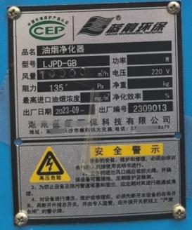 油烟净化设备必须具有环境保护产品认证证书,必须由正规厂家生产,铭牌上必须标明净化风量、功率、生产厂家、地址、联系号码等信息,油烟净化设备集气罩罩口投影面积应大于油烟产生面。
