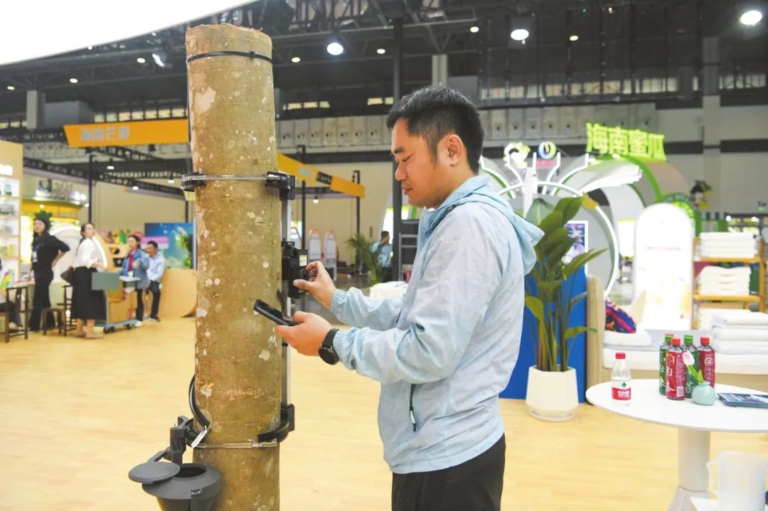 在农垦集团展区,工作人员在调试智能割胶机。记者 杨鹤 摄展台布置新意满满