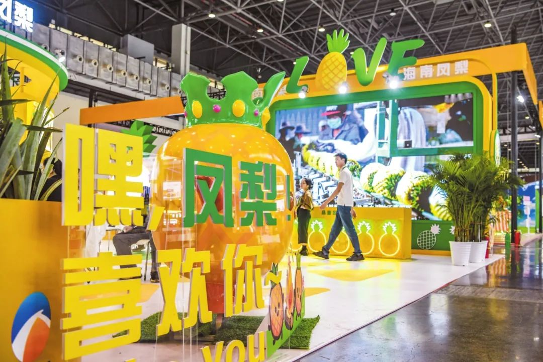 海南凤梨展馆。记者 杨鹤 摄本届冬交会以“聚农业精品·享自贸商机”为主题,布设6个展馆、2个活动区和1个户外展区,展览面积约8万平方米,重点展示全球农业精品及海南热带特色高效农业发展成果,涵盖瓜果蔬菜、粮油、茶叶、咖啡、畜牧、水产、智慧农业、休闲农业等品类和业态,万余名采购商将赴冬交会现场洽谈采购。