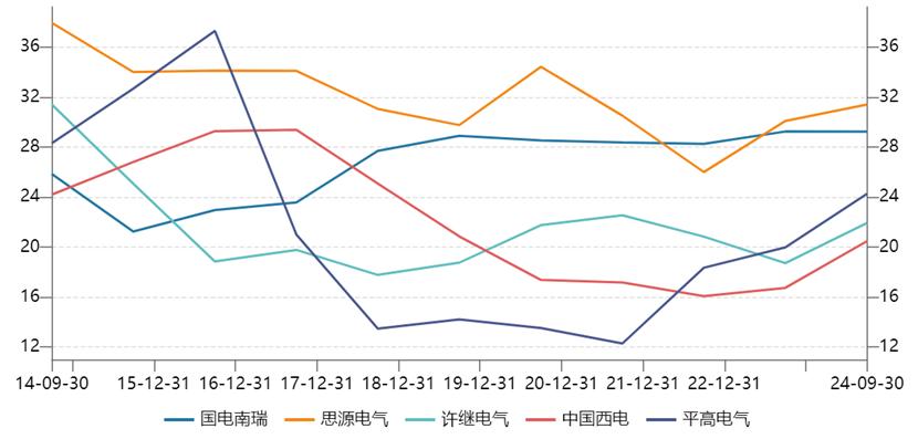 截止2024年前三季度末,思源电气毛利率最高,为31.4%,比其余四家均要高一些。拉长时间看,思源电气、国电南瑞整体均高于其余三家,盈利能力更强一些。值得注意的是,平高电气毛利率从2021Q3的12.3%大幅飙升至2024Q3的24.3%,改善最为明显。
