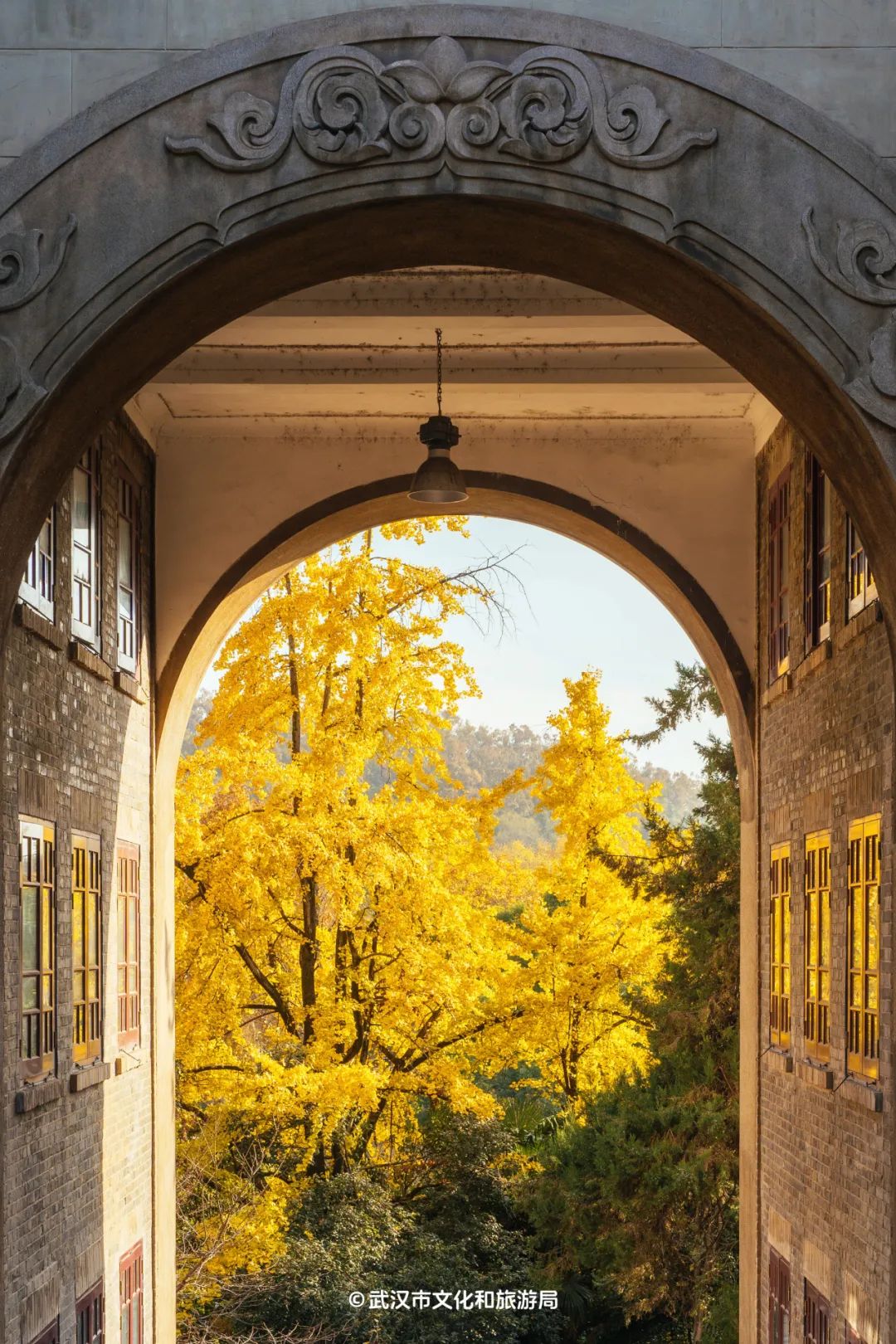 文旅君更推荐首义路尽头的起义门,沿着城墙一路向东,银杏、无患子、鸡爪槭层层叠叠,绵延上百米,树下络绎不绝的行人,让这座古城门重新焕发了生机。要是不想人挤人,起义门旁边的「风雨长廊」也有几棵金灿灿的银杏,伫立在古朴的长廊边,诗意不输城墙之上。