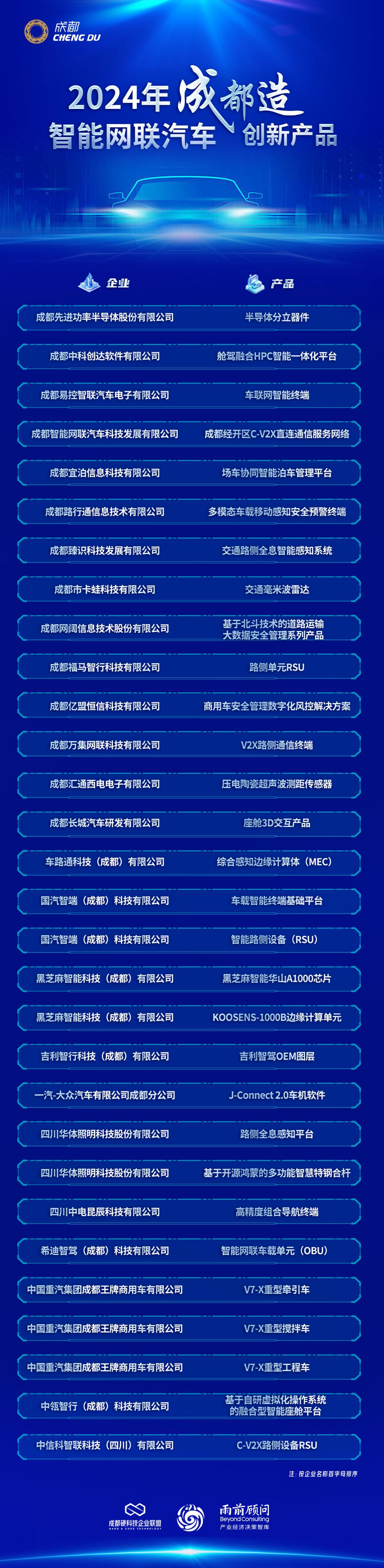日前,雨前顾问、成都硬科技企业联盟、四川省天府峨眉计划专家联谊会联合发布了《2024年“成都造”智能网联汽车创新产品30强》。其中,成都经开区(龙泉驿区)5家企业的产品入选榜单,覆盖智能硬件、综合服务、网联生态和路侧设施等多个领域。