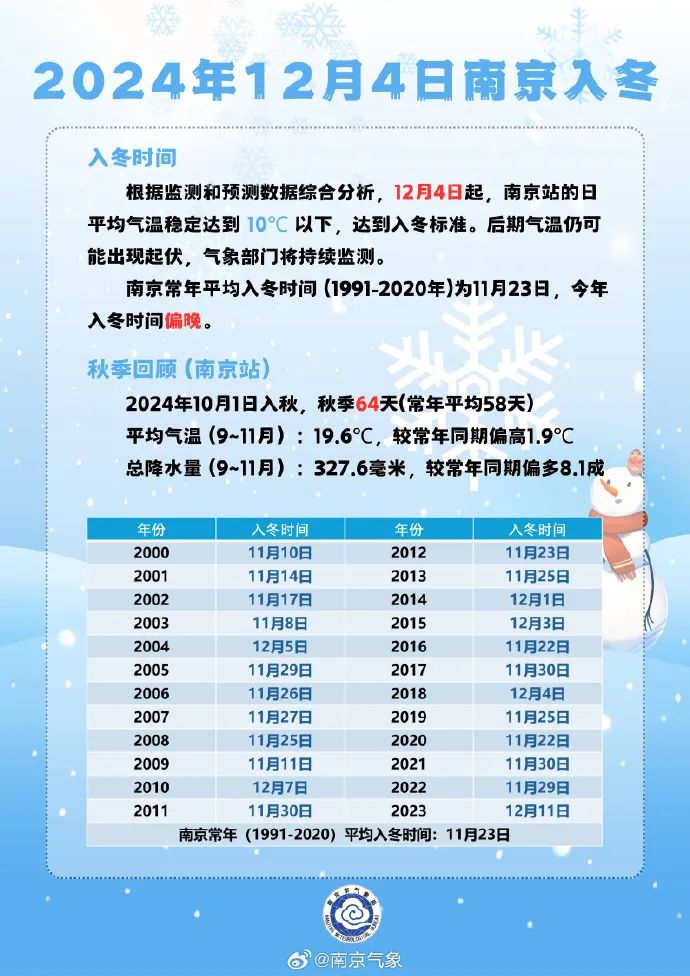 根据监测和预测数据综合分析,12月4日起,南京站的日平均气温稳定达到10℃以下,达到入冬标准,今年入冬时间较常年偏晚。今年秋季累计64天(10月1日入秋)。