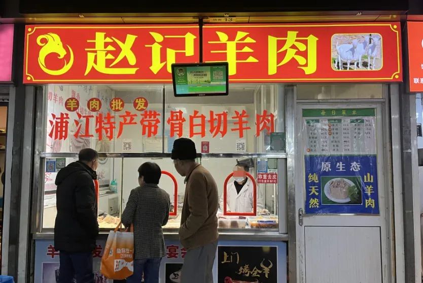 一楼有家“赵记羊肉”,卖的白切羊肉,店里的羊肉都是浦江山羊肉,羊排80元/斤,羊腰80元/斤。