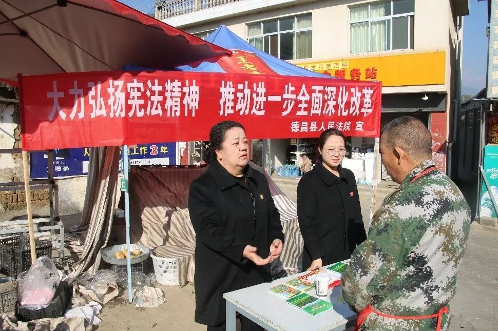 德昌县法院干警走进巴洞镇开展宪法进乡村宣传活动,在人员密集的场所悬挂横幅、设立咨询台,向来往群众发放宪法普法宣传单、禁毒防艾宣传单及森林草原防火宣传单等,同时针对农村基层常见矛盾纠纷,用群众身边的真实案例,通过互动参与的方式,向群众们释法明理。