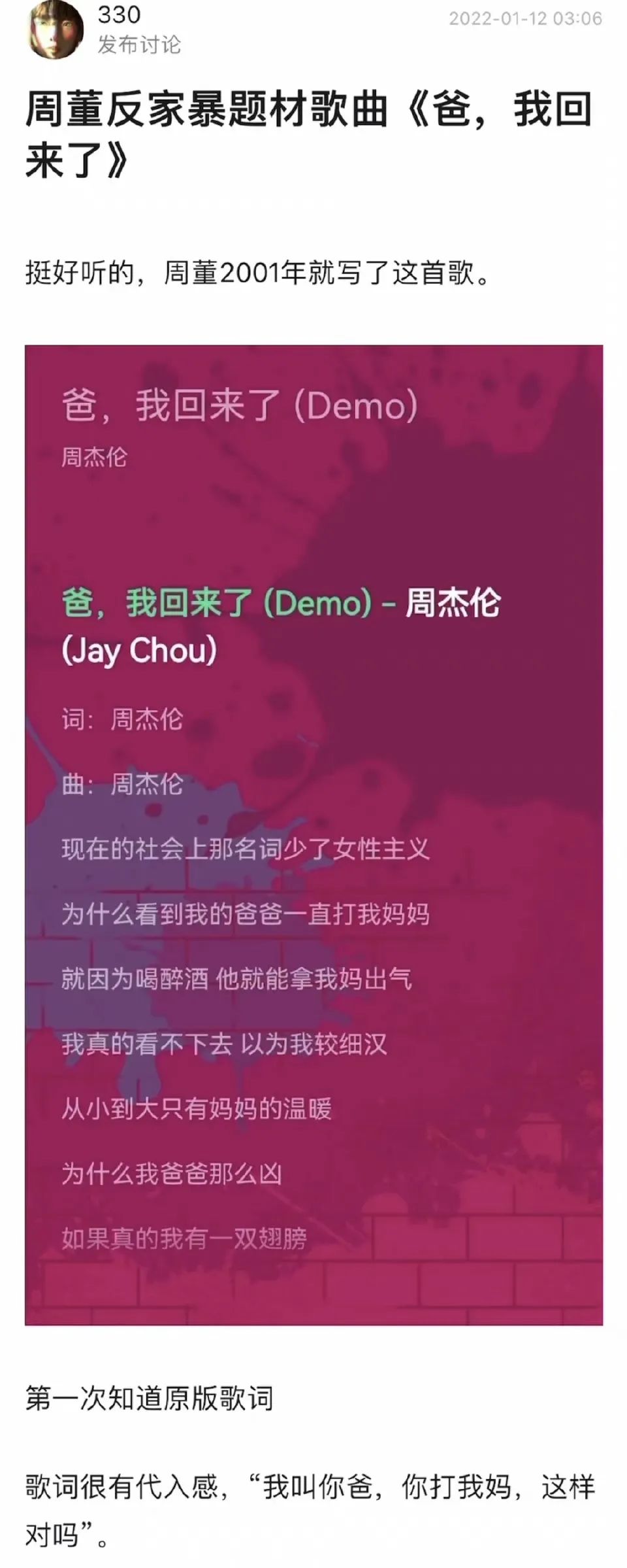 并再次澄清《爸我回来了》歌词