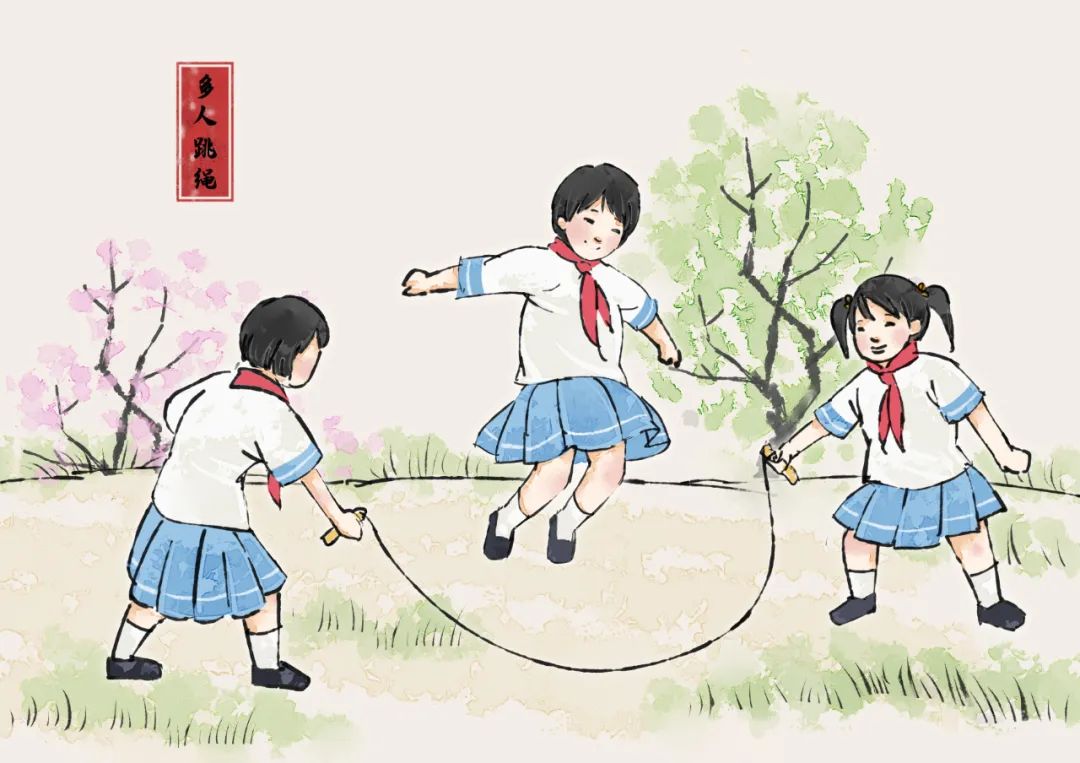 当年跳绳的花样已有不少,从起跳的方式来说,有双脚跳,有单脚跳,还有单脚交换跳;从摇绳的方向来看,有正跳和反跳;从人数来说,有单人跳、双人跳、多人跳、轮换跳等。几十年后的今天,跳绳的花样更加丰富多彩,不光中国人,外国人跳得也很好,各种跳绳的吉尼斯世界纪录不断被打破。但是,我还是怀念从前的跳绳,因为它包含了更真实、更单纯的快乐。
