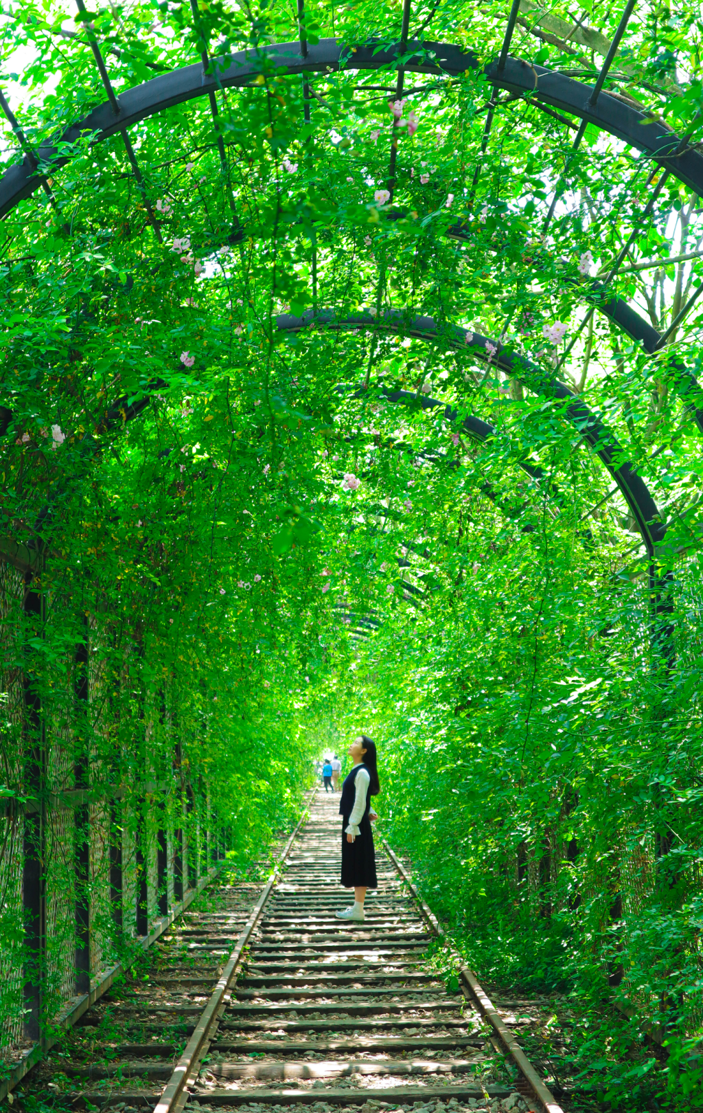 铁轨、枕木、路灯、茂林、繁花