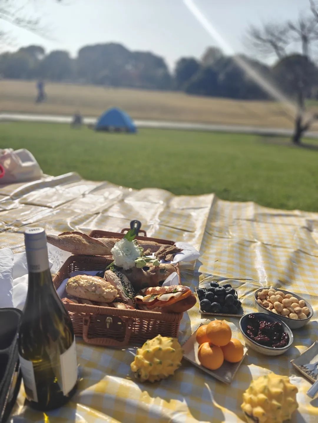 难得冬日暖阳,带上吃的喝的,一定要有酒杯和盘子,铺一个大大的野炊垫,一定要大。暖洋洋的感觉很舒服。推荐辰山植物园2号门进去的大草坪,刚刚换好草,很绿很舒服。