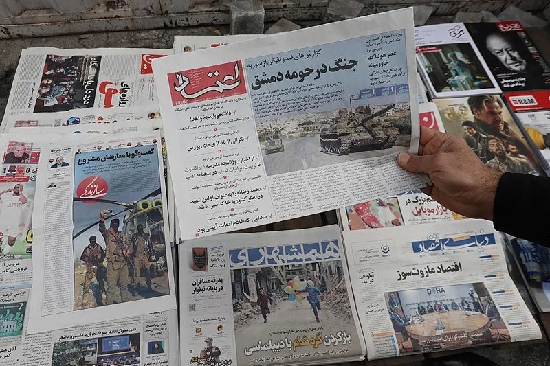 当地时间2024年12月8日,伊朗德黑兰,报摊上放着当地报纸,头条新闻报道叙利亚局势。波斯文标题为:“大马士革郊区的战争”。 视觉中国据伊朗伊斯兰共和国通讯社(IRNA)当地时间12月8日晚间报道,伊朗总统佩泽希齐扬当天在召开内阁会议时,回应了阿萨德政府垮台一事。