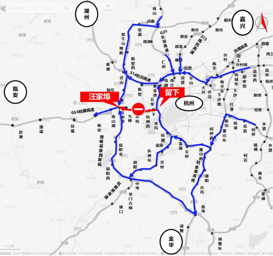 (3)由绕城高速—紫金港枢纽—杭长高速——径山枢纽—绕城西复线高速—汪家埠枢纽—杭徽高速绕行