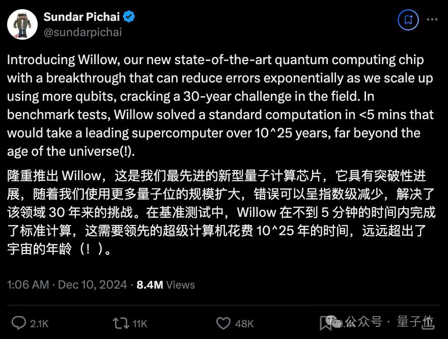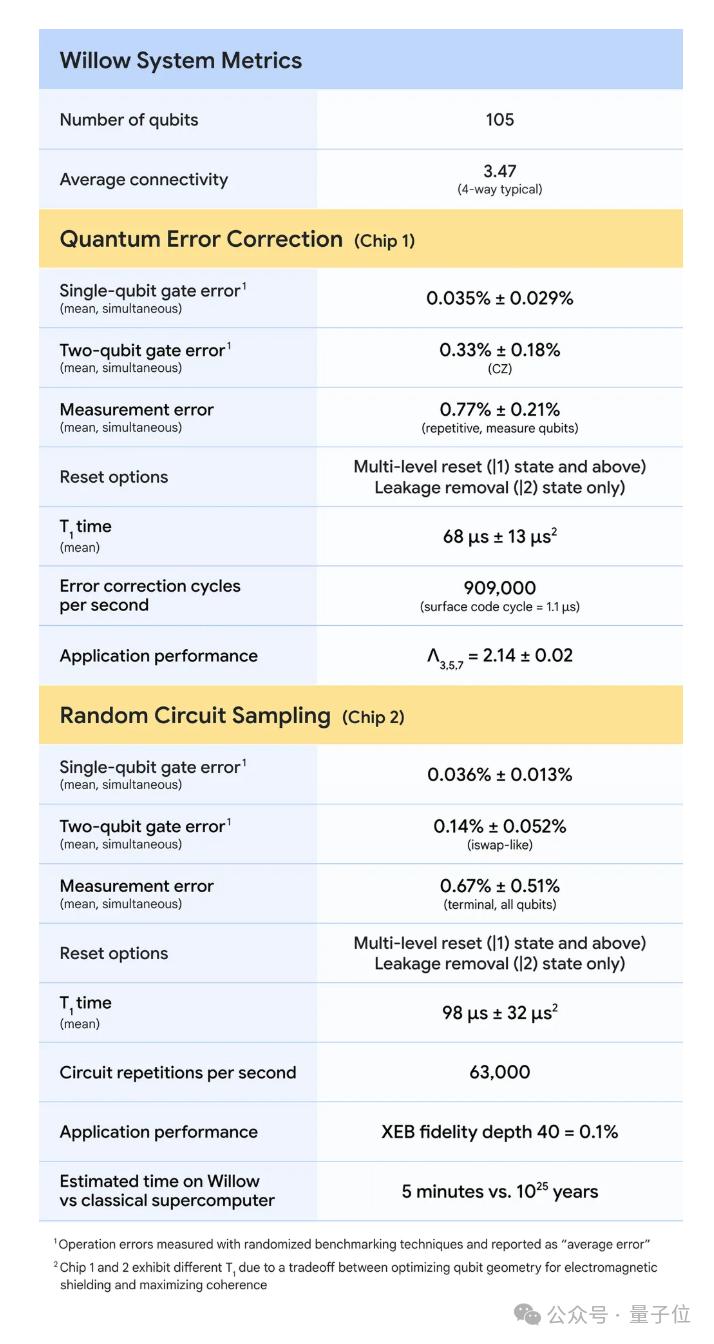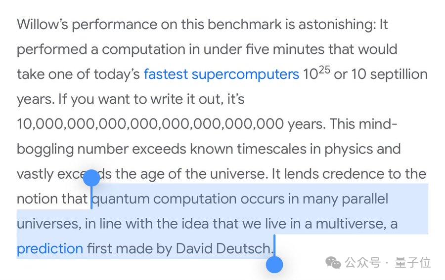 Willow在不到五分钟的时间内完成了一项计算,而今天最快的超级计算机则需要10⊃2;⁵年。如果要写出来,那就是10000000000000000000000000年。