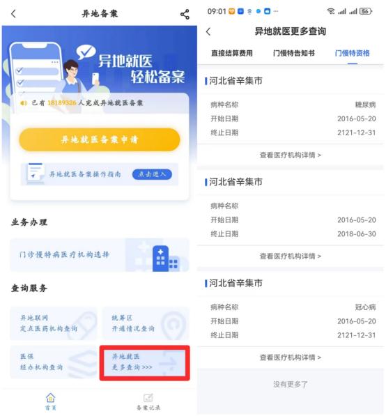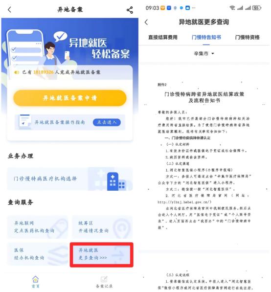 2、登录国家医保服务平台APP,在“异地备案”服务专区,点击查询服务下的“异地就医更多查询”-“门慢特告知书”,即可了解参保地门诊慢特病相关治疗费用跨省直接结算政策、结算流程等内容。
