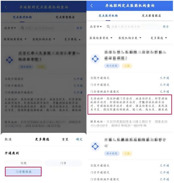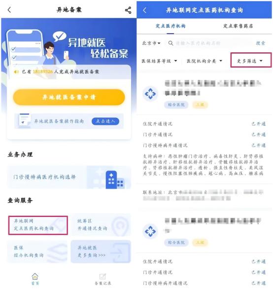 四、哪些医疗机构可以提供10种医保门诊慢特病相关治疗费用跨省直接结算服务?登录国家医保服务平台APP,在“异地备案”服务专区,点击查询服务下的“异地联网定点医药机构查询”,选择就医地,输入定点医疗机构名称,查询定点医疗机构门诊慢特病结算开通情况及支持病种;也可以点击“更多筛选”,在“开通类别”中选择门诊慢特病,查询就医地开通的所有门诊慢特病费用跨省联网定点医药机构。