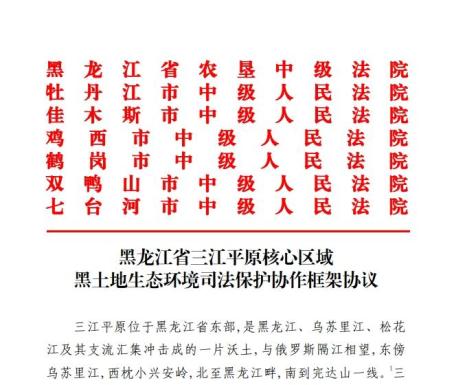 为深入贯彻习近平生态文明思想和习近平法治思想,加强三江平原核心区域黑土地生态环境司法保护,积极构建司法保护一体化格局。近日,农垦中院联合牡丹江中院、佳木斯中院、鸡西中院、鹤岗中院、双鸭山中院、七台河中院签订《黑龙江省三江平原核心区域黑土地生态环境司法保护协作框架协议》。