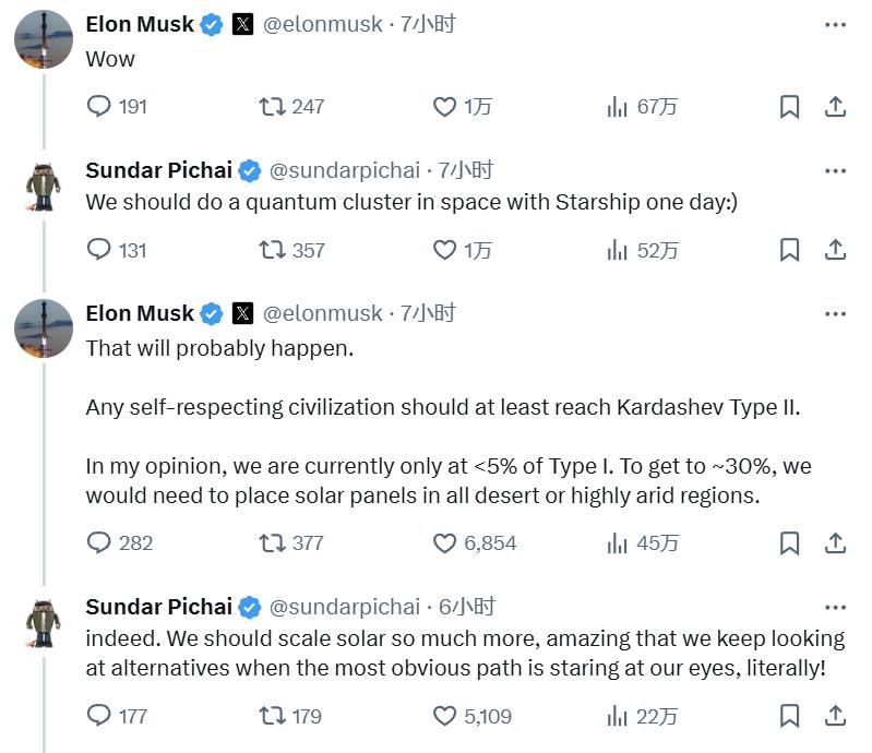 这一突破性成就立刻赢得了一片惊呼之声,伊隆・马斯克也惊呼点赞,并且他与桑达尔・皮查伊的互动中还畅想了一下未来:未来或许会使用 Starship 在太空中建造量子计算集群,为此必须大规模收集太阳能。