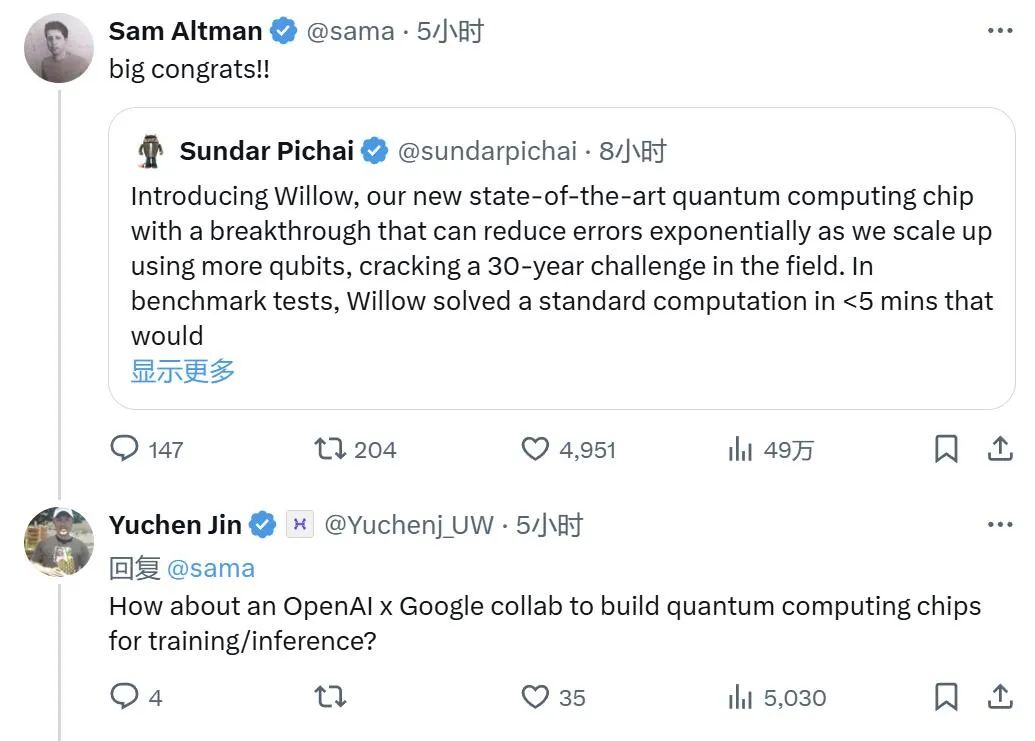 OpenAI CEO 山姆・奥特曼在自己的发布结束后也特意向皮查伊祝贺。Hyperbolic 的联合创始人、CTO Yuchen Jin 在底下表示:要不 OpenAI 和谷歌合作,用量子芯片训练 AI 吧?