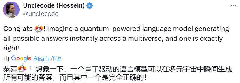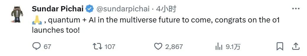 皮查伊回应道:量子加 AI,创造多元宇宙未来,也恭喜 OpenAI o1 的发布。