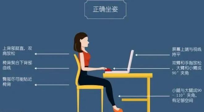 正确的坐姿应该让自己的体重平均分摊于椅子上,上半身不前倾,腰部打直,肩颈自然放松,手肘约弯曲90°,双脚平放地面。树立正确的坐姿,能减少颈椎病发病率。