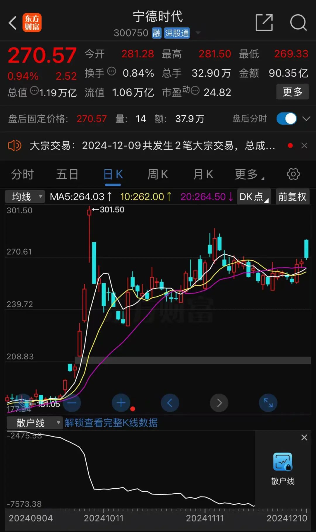 截至12月10日收盘,宁德时代报270.57元/股,涨幅0.94%,市值1.19万亿元。