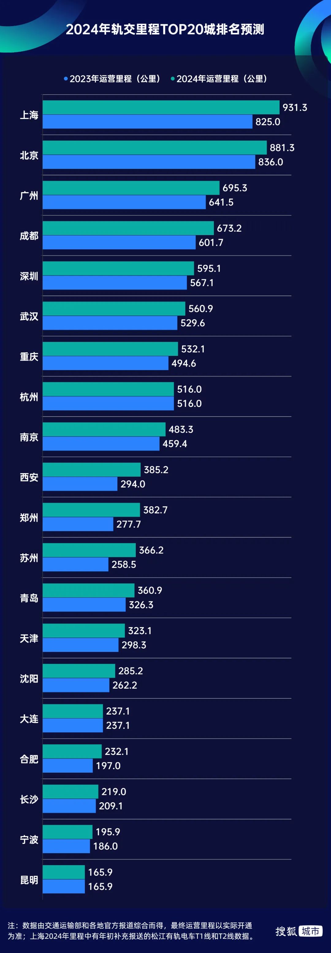 有些城市意气风发——上海重回榜首,轨交总里程将超900公里,率先冲刺“1000公里轨交”新时代;苏州、郑州是今年的“增长王”,新增运营里程超100公里;西安连超天津、青岛,晋级北方第二城。