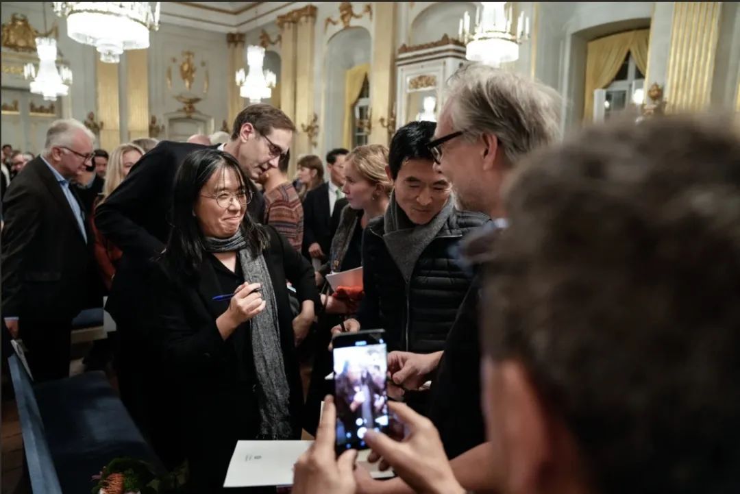 演讲结束后韩江在台下交流本届获奖者的获奖证书