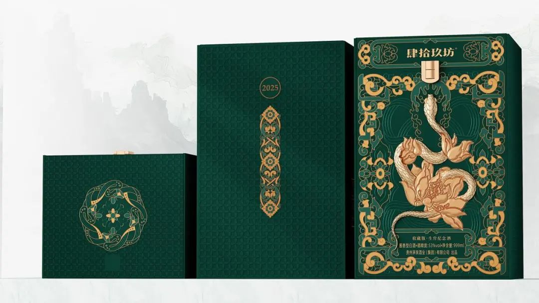 肆拾玖坊蛇年生肖酒的设计主题为“碧水绿,金蛇舞”,寓意喜迎新年,福运连绵。整体设计延续了肆拾玖坊生肖系列包装形式,在插画风格上有所突破,外部原创手绘如意缠枝宝相花纹,正中立体金蛇依托莲花盘绕向上,展现出华贵典雅的同时,也体现了中国传统文化的传承与活力。