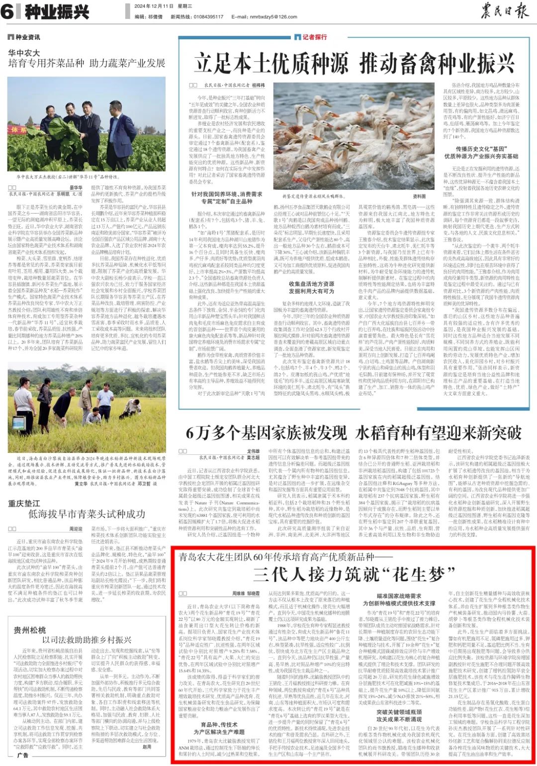 今天,《农民日报》第6版种业振兴以《青岛农大花生团队60年传承培育高产优质新品种——三代人接力筑就“花生梦”》为题,报道了学校自上世纪60年代开始,历经三代传承,致力于花生丰产增效栽培技术研发、优质高产品种选育、花生机械装备研发和花生食品研究,为保障国家粮油安全和助力粮油产业发展,持续做出重要贡献。