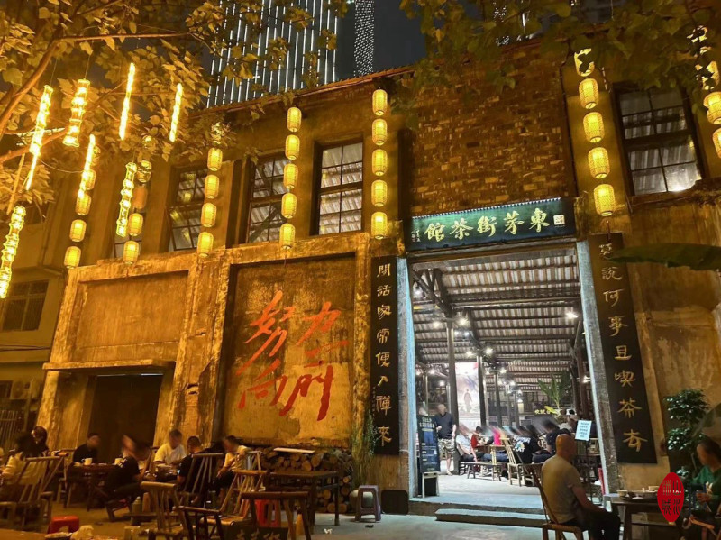 门口“努力向前”的标语,凹凸不平的水泥地面,斑驳的墙壁,老式木桌条凳竹椅……厅堂中央的语录碑、墙上的湖湘名人画像,传承着独属于长沙的文脉基因。这家茶馆并非新建筑,原本为二轻联社大礼堂,后改为长沙市第三制鞋厂。如今这座工业老厂房焕新颜,打造成市井老茶馆。
