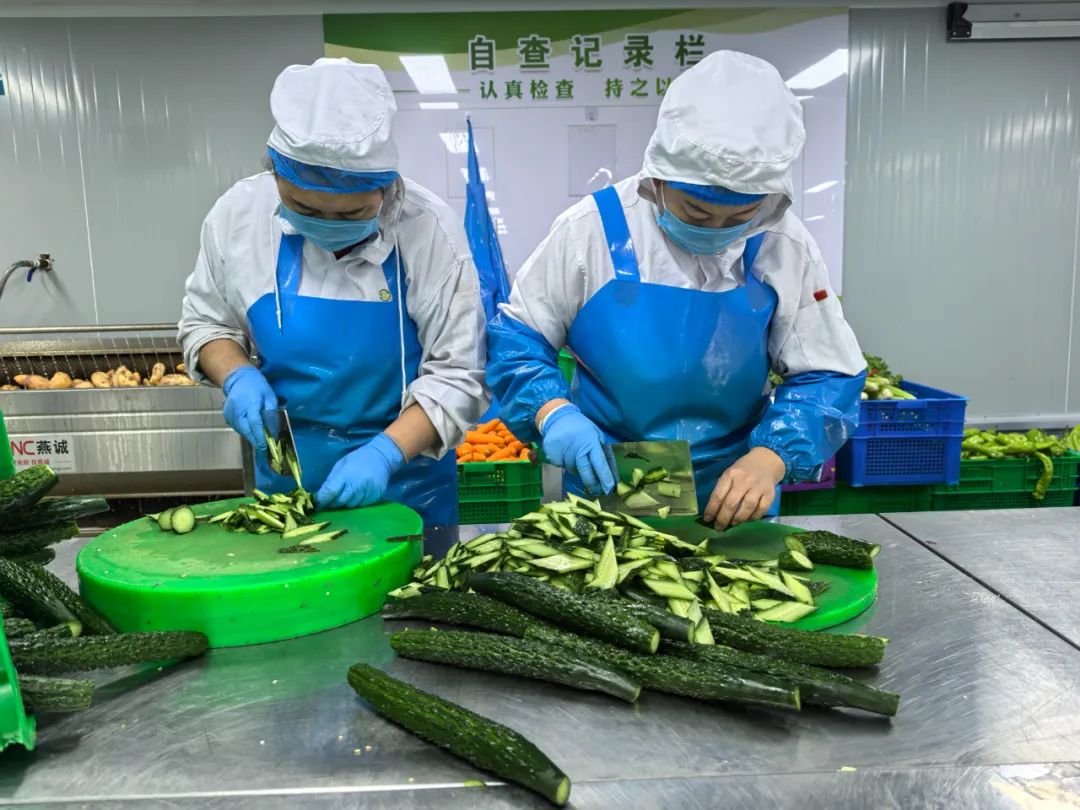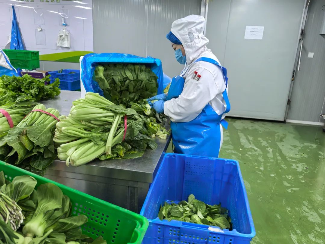 走进食品加工区净菜标准化加工车间,工人们正在根茎切配、叶类切配、整棵蔬菜清洗等各条流水线上紧张有序地忙碌着。