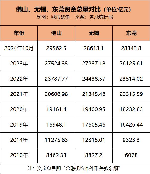 下面是佛山、无锡、东莞三个城市资金总量的一个简单对比: