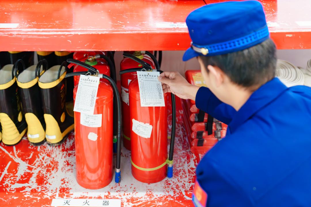 在消防控制室,消防员们对灭火器的性能状况、压力指示是否处于正常范围、筒体有无锈蚀变形、喷管是否畅通无阻进行了细致入微的检查。