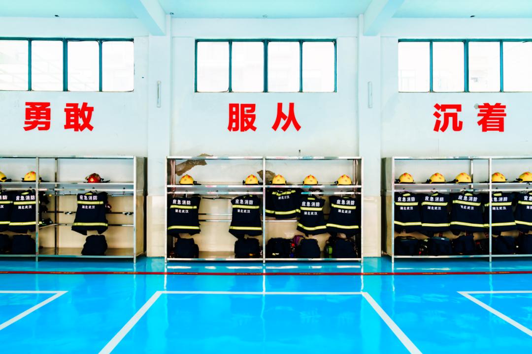 装备室内,消防服、消防头盔、各类器械等整齐排列,各安其位,严谨有序。一切都在无声中满溢着力量。