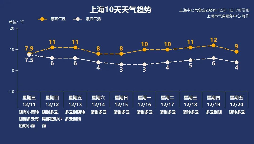 降温:13日(周五)中午冷空气开始影响本市,气温下降。预计在13日至15日期间48小时最低气温降幅,市区下降3~5度,郊区6~8度。15日至18日大部分郊区的最低温度都将在冰点以下。过程最低温度出现在15日和16日早晨,市区跌至3℃左右,崇明、金山、奉贤和青浦等郊区零下3℃到零下4℃,有薄冰或冰冻。
