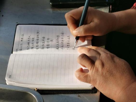 早上八点多,吴红立的煎饼摊前顾客渐少,她抽出空,就坐在餐车旁,拿起纸和笔,安静地创作诗歌。