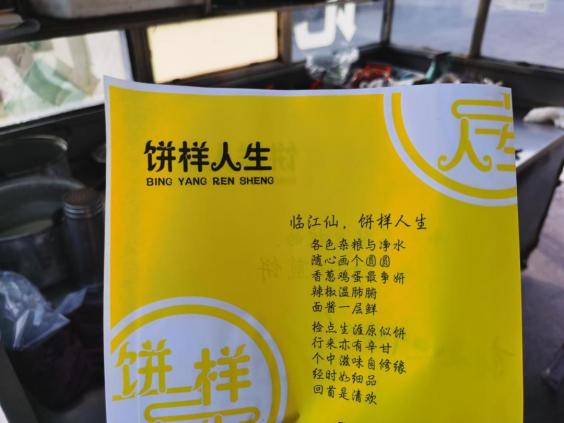 作为一名会写诗的煎饼摊主,吴红立总觉得应该做点什么。去年,她翻出来五六年前创作的《饼样人生》——一首专门写煎饼的诗。多次修改,最终定稿,花400元将这首诗印在煎饼的包装纸上,用来包煎饼。目前,吴红立已送出去5万多张包装纸。