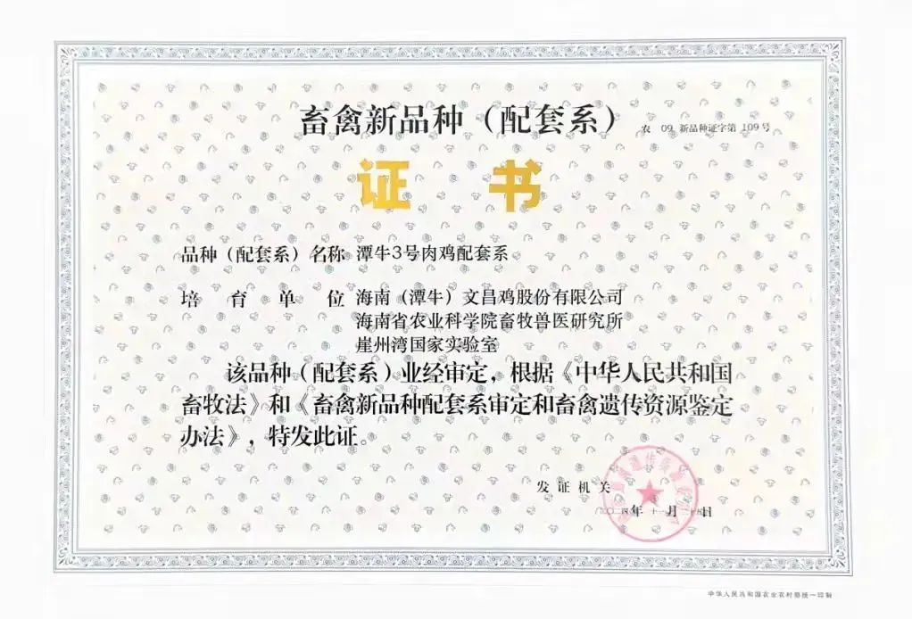 近日,农业农村部正式发布最新一批国家畜禽遗传资源委员会审定鉴定通过的新品种(配套系)及遗传资源名单,海南“潭牛3号”肉鸡配套系成功通过审定。详情(来源:南海网)