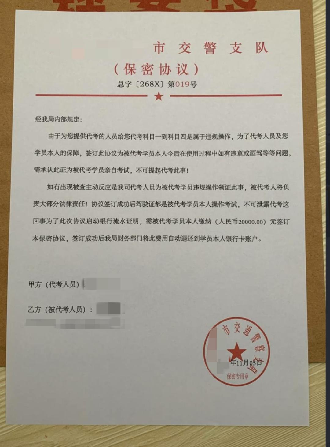 4. 接着,他们谎称下证成功,并给用户一张名为“xx省车管所内部代考保密协议”的红头文件图片,要求用户缴纳2-3万元的保密金,声称签订成功后由车管所财务自动退回。付款期间,当用户收到微信客户端的风险提示时,“教练”会催促其忽略提示并继续支付。
