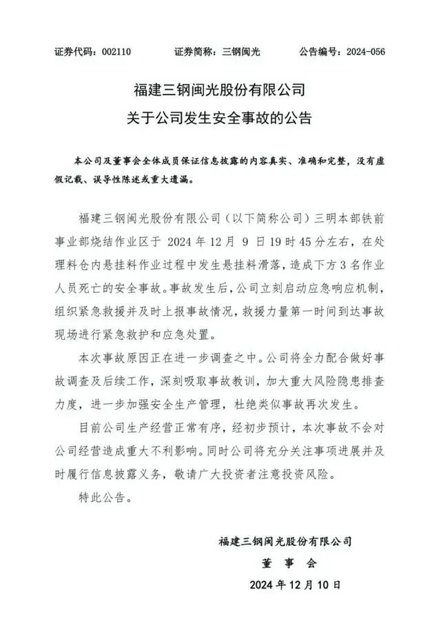 青海西宁特殊钢股份有限公司2024年12月3日发布公告称,公司炼钢厂于12月2日发生一起安全事故,经初步调查,系公司炼钢车间2名员工在车间开展检修作业时,发生精炼炉罐盖掉落意外,经抢救无效死亡。