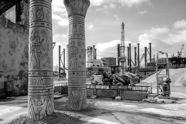 《现代文明遗迹》系列以象征性建筑和景观为载体,探讨现代文明的发展及其深远影响,旨在引发人们对“现代废墟”的关注,并思考人类文明未来的方向。本系列第1号作品通过镜头捕捉浮雕柱的古老辉煌与废弃工业场景的荒凉对比,以鲜明的冲突呈现“文明遗址”与“废墟建筑”交融的超现实意境。暗示了人类历史中不可避免的循环:无论是古代的辉煌建筑还是现代的工业成就,终将被时间侵蚀,化为新的遗迹。这种黑白影调的运用不仅凸显了历史的厚重感,更深刻表达了对人类文明未来的隐忧与反思。