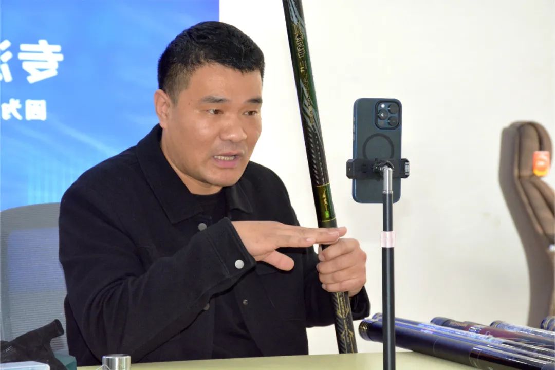 工作人员正在直播平台推介渔具产品。