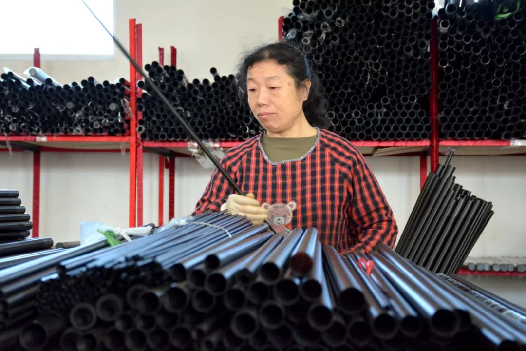 工人正在对鱼竿进行质检。裁剪、卷制、缠带、固化、成型……在献县陌南镇渔具生产车间,一台台全自动鱼竿生产设备一字排开,平整结实的碳布经过加工生产变成了畅销的碳纤维鱼竿走进“千家万户”。