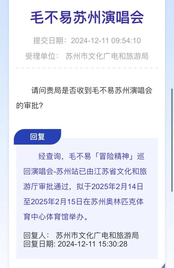 毛不易苏州演唱会审批已通过!