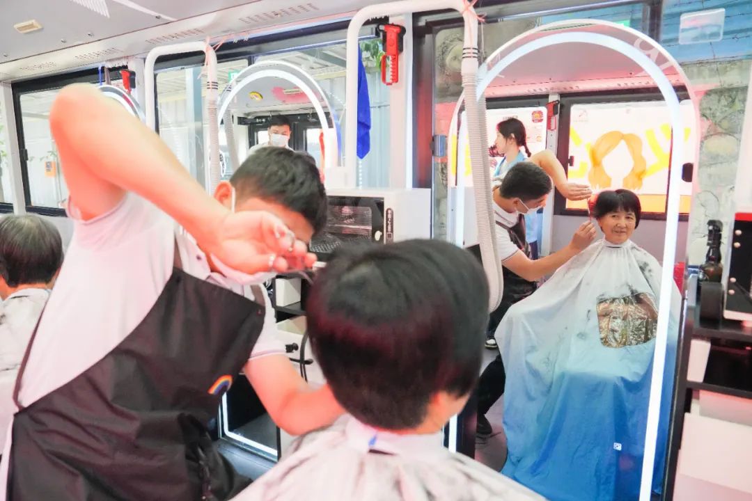 吸引了一群居民排队上车等着理发
