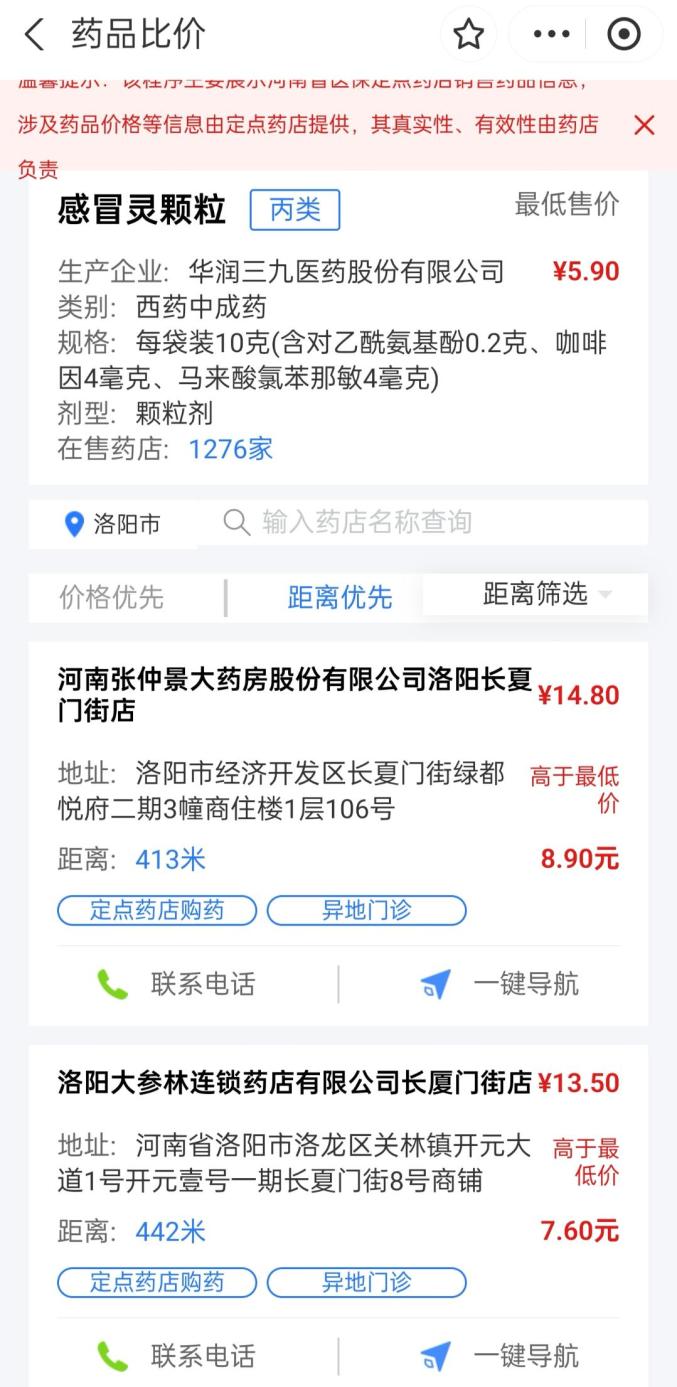 该系统还支持“查看在售药店”,点击后可选择按价格或距离优先展示结果,真正实现“货比三家”,同时,药品比价系统还提供药店的联系电话和位置导航服务,方便咨询和到店购药。根据相关规定,除麻醉药品和第一类精神药品外,其他药品实行市场调节价,药店可自主定价。当前展示的药品价格为近日医保结算价格,市民购药前可致电相关药店了解情况。