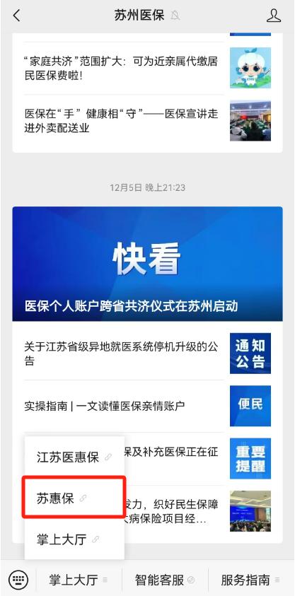 ②关注【苏州医保】公众号主页,点击底部菜单栏【掌上大厅】选择【苏惠保】立即参保;